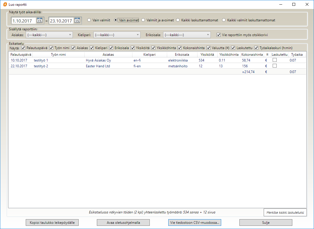 Raporttinäkymän tietoja voi alalaidan painikkeilla kopioida leikepöydälle, tallentaa csv-tiedostoon tai avata oletusohjelmalla, kuten Excelissä. Painikerivin yläpuolella näytetään vielä raportissa näytettävien töiden kokonaislaajuus sanoina, sivuina ja/tai muina käännösyksiköinä. Oikean alakulman painikkeella voit kätevästi merkitä esimerkiksi kaikki tietyn asiakkaan työt kerralla laskutetuiksi sen sijaan, että tekisit merkinnän jokaisen työn tietoihin yksitellen.